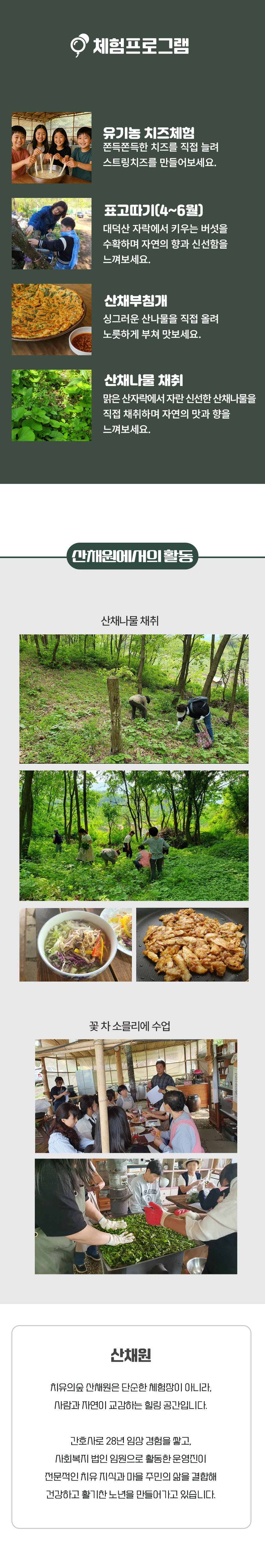 유기농 치즈체험, 표고따기(4~6월), 산채부침개, 산채나물 채취 등