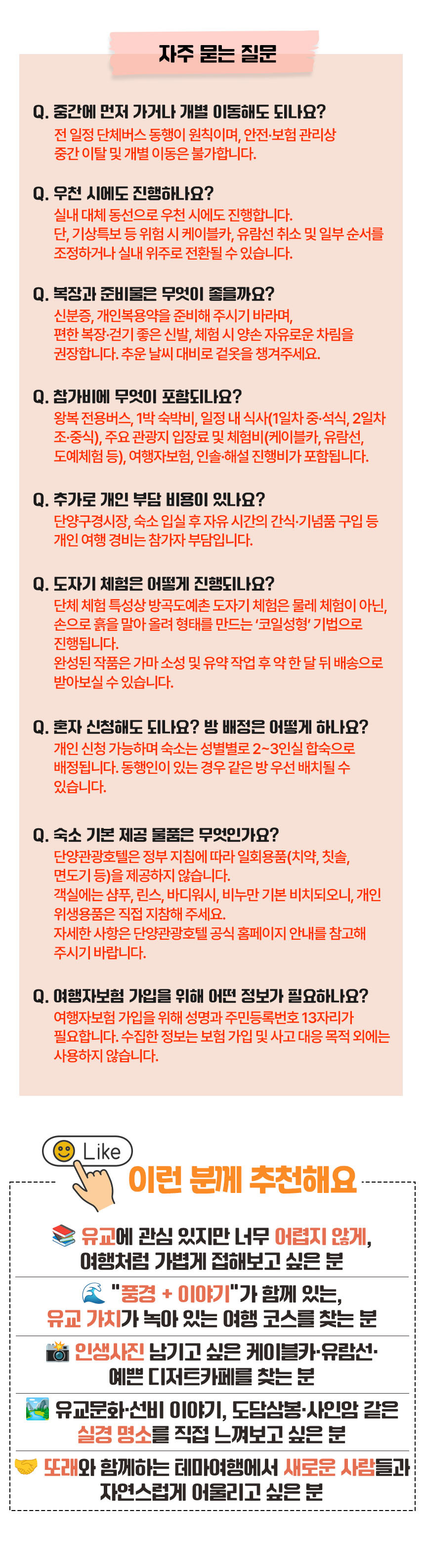 | 여행상품 가격 (유류할증료, 공항이용료, 전쟁보험료, 관광진흥개발기금, 운송요금, 숙박요금, 식사요금, 가이드 경비, 여행자보험료, 현지관광입장료 등 소비자가 특정 여행상품을 선택할 경우 부담해야 하는 모든 경비가 포함되어야 함. 다만, 가이드 경비를 현지에서 지불하여야 하는 경우 별도로 그 금액을 표시할 수 있으며, 현지에서 별도로 지불해야 한다는 점을 표시하여야 함) | 컨텐츠에 기재된 상세설명 참조 | |