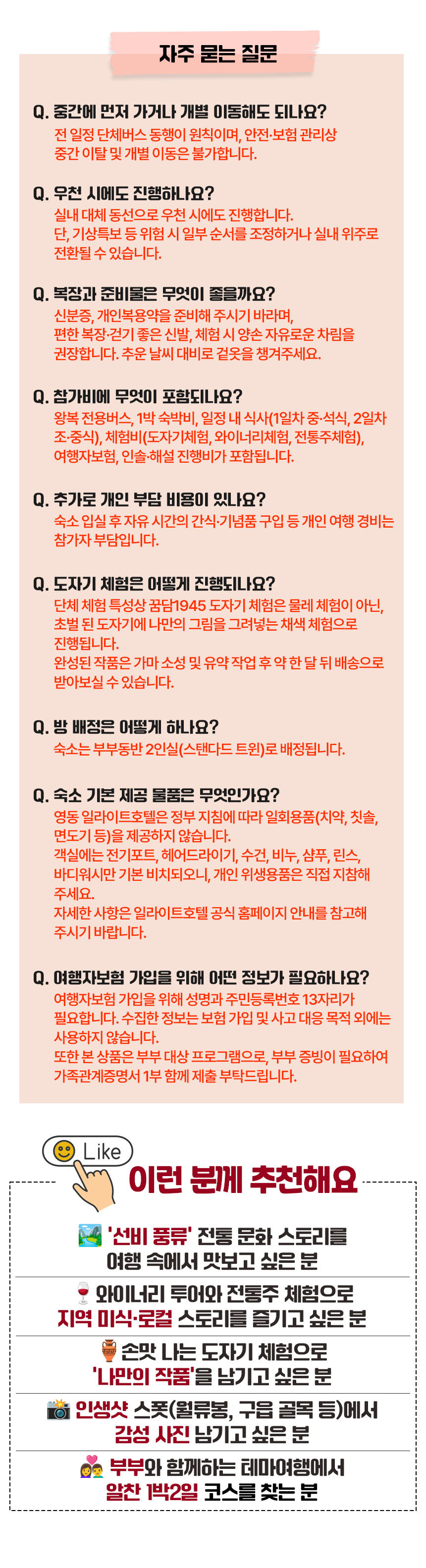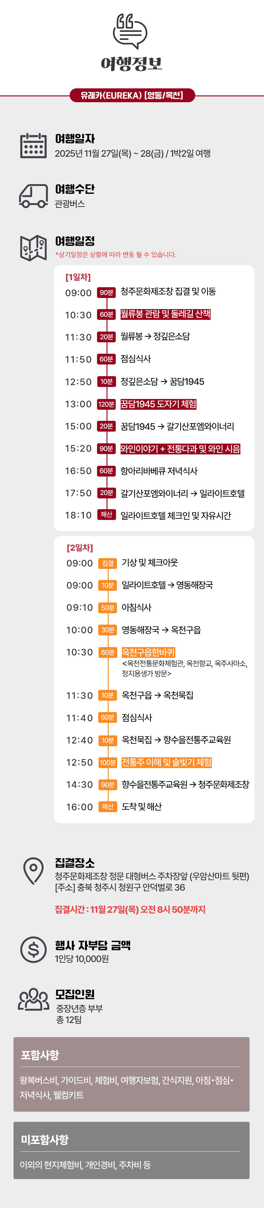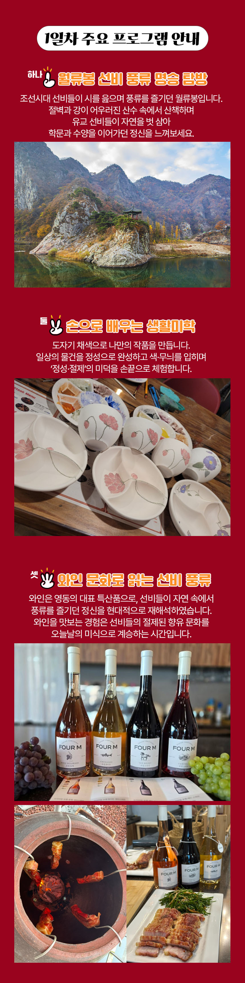 월류봉 관람, 도자기체험, 와인이야기, 와인시음 및 전통다과, 옥천구읍한바퀴, 전통주빚기, 숙소, 식사(아침1,점심2,저녁1)